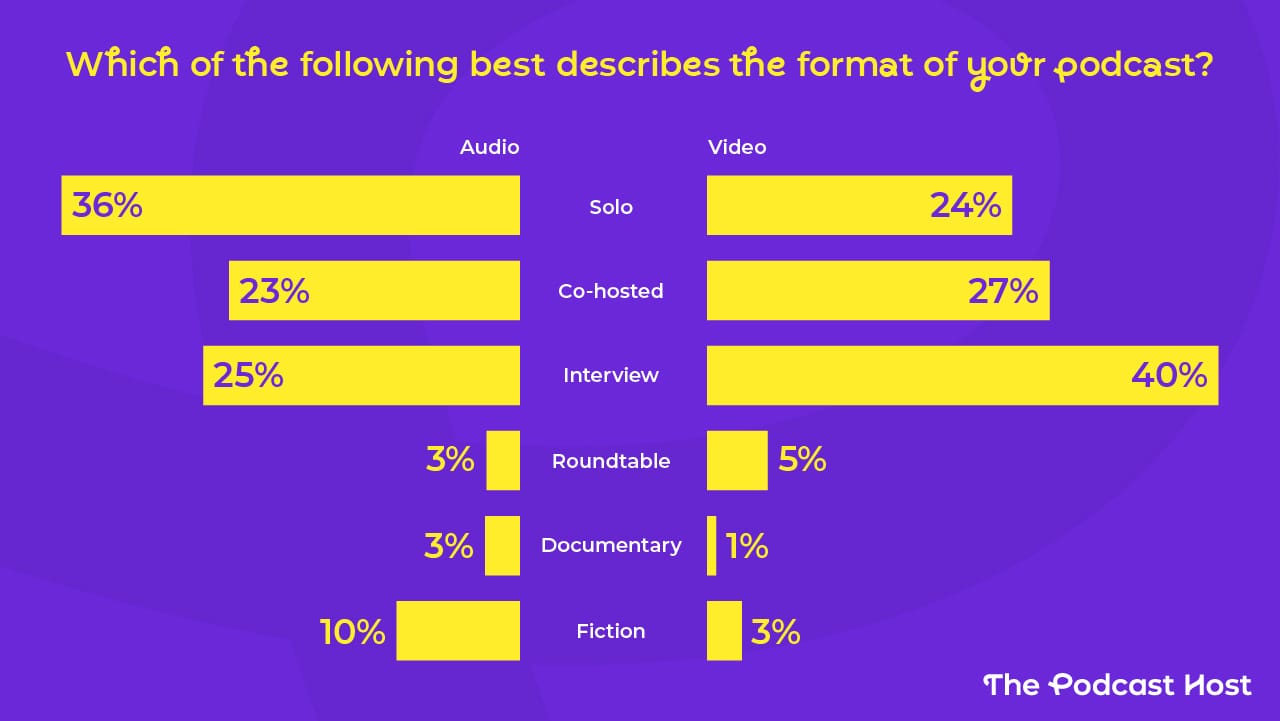 Video podcasters are much more likely to run chat-style shows. That isn't just true for the indies, where 40% do interviews compared to 25% of audio-only creators, but big networks and brands can keep costs down and increase output by following this format, too.