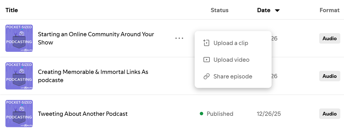 Uploading a vertical, "TikTok-style" clip on Spotify doesn't replace your episode. Clips are separate Spotify-native promotional assets.